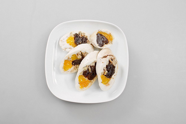 Еще один удачный пример дружбы курицы и мандаринов. Рулет этот хорош тем, что фаршировать его можно чем угодно — грибами, овощами, пряным булгуром и чем-нибудь еще.
