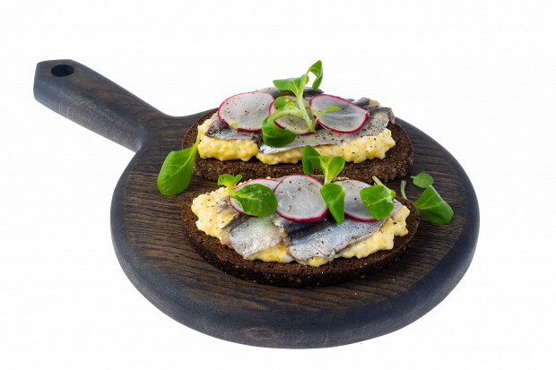 Килька пряного посола — очень насыщенная еда, и ей не хватает чего-то свежего. В идеальном раскладе — огурца или редиски (как и есть в нашем случае). А скрепляют этот союз майонез и яйцо.