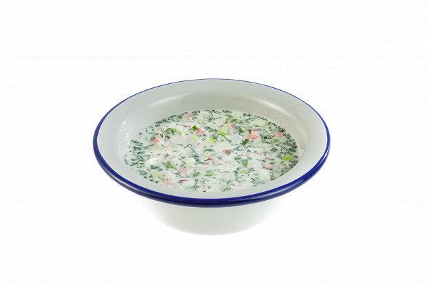 Окрошка без редиски — недоразумение. В этой кефирной окрошке, помимо классического набора ингредиентов (да, тут есть и салями), есть еще и газированная вода — она делает суп более освежающим.