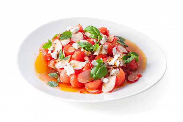 Идеальный летний салат, в котором встречается редиска, свойственная началу лета, и арбуз — характерный для заката лета. Редиска звонкая и хрустит, арбуз — нежнейший и истекает соком, вместе они — лучшее, что может случиться с человеком в жару.