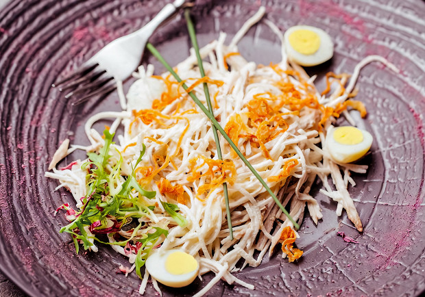 Классический советский салат, в котором изначально присутствует редька, но где редька, то там и родственная ей редиска. Оба эти представителя семейства капустных дают салату звонкость и оттеняют белковую питательность отварной телятины. Рецепт от Сергея Сущенко, корпоративного бренд-шефа ресторанов «Чайхона №1 братьев Васильчуков».