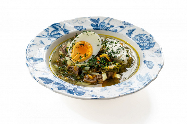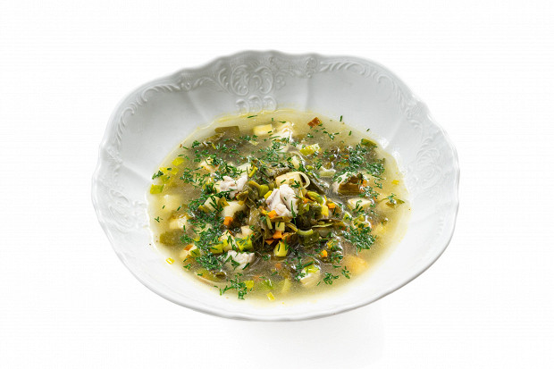 Почти домашняя классика, которую мы несколько осовременили: вроде бы щавелевый суп, но в нем есть и сибас, и редкий для русской кухни лук-порей.