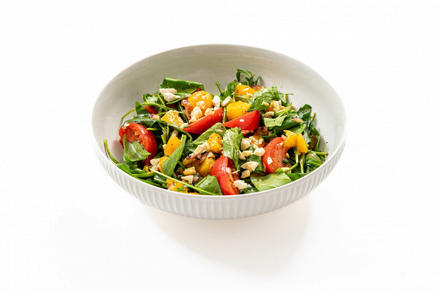 Отчасти десертная композиция: сладкий персик (может быть консервированный, как у нас, а может быть сырой) сочетается со щавелем — с его яркой кислинкой, с медом и с чуть сладковатым кешью. Оттеняют их лук, рукола и оливковое масло.