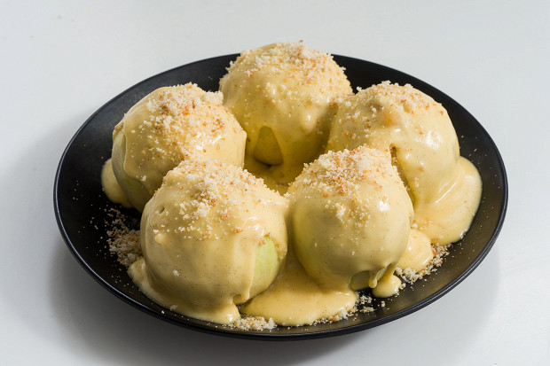 Красивый рецепт, где яблоки предстают в виде сочных шариков, приготовленных с помощью техники су-вид. Также понадобится яблочное пюре и идеальный ванильный пломбир.