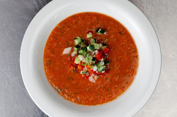Две паэльи — овощная и курино-креветочная, — хек в зеленом чесночном соусе, тосты с баскским перечным салатом, гаспачо и крем-суп из перца и помидоров, яичница тортилья — и видеорецепт крема-каталана.
