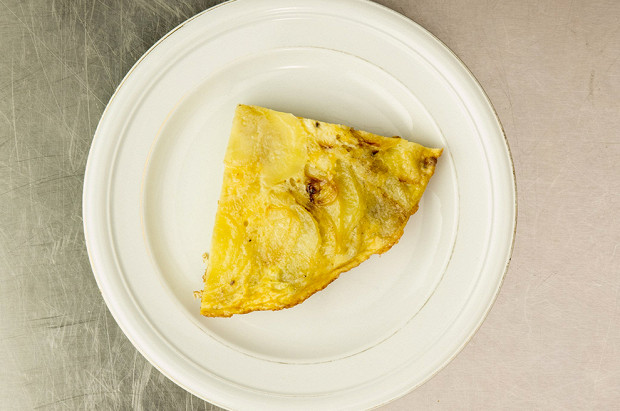 Классический испанский омлет, секрет которого в том, что картошку для него надо нарезать действительно очень тонко. Обычно тортилью подают в перевернутом виде, для чего нужно положить сковороду вверх тормашками на большую тарелку и несколько раз ударить по тыльной стороне. После этого тортилья сама вываливается на тарелку.