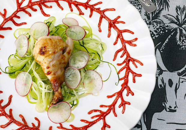 Самое примечательное в этом рецепте — то, каким образом готовится курица. Ее сначала нужно отварить в остывающем бульоне (да, и так можно делать — просто оставить птицу в горячем бульоне на плите, предварительно выключив огонь), а затем чуть потомить в духовке, для обретения характера. Подавать с сочной лапшой из цукини и редиской.