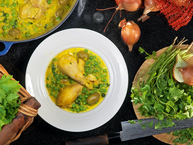 Курица с шафраном, оливками и горошком