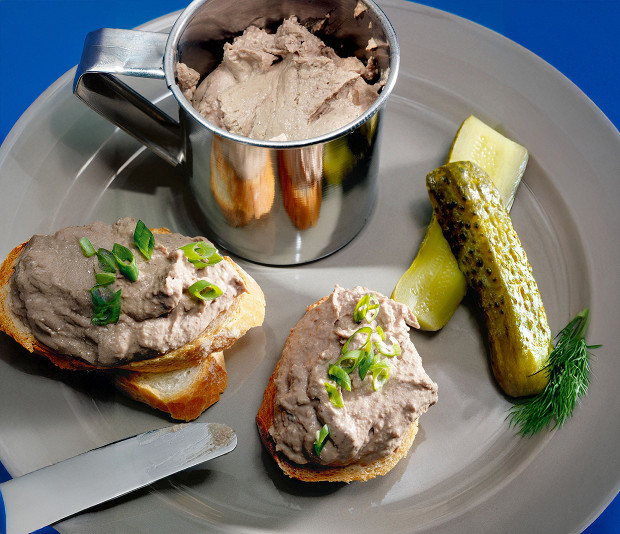 Какая текстура будет у этого паштета, решать вам. Если хочется грубоватой, поменьше работайте блендером, если хочется воздушной, почти как у мусса, — взбивайте хорошо. И помните: печень перед готовкой надо осмотреть и избежать наличия в ней желчи, иначе все будет горчить.