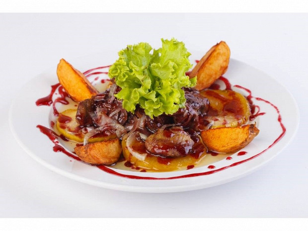 Куриная печень с яблоками в соусе из портвейна и брусники