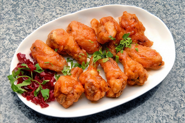Крылышки с очевидно азиатским характером, который тут формируется благодаря соевому соусу и кунжутному маслу. Кукурузная мука, входящая в состав этого азиатского маринада, придает крыльям хруст и золотой оттенок.