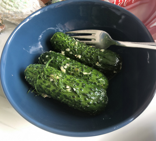 Этот рецепт требует 8-часовой выдержки огурцов в рассоле, где, помимо соли, присутствует и сахар. Этот рецепт мы добыли в ресторане «Dr. Живаго», где под такие огурцы было выпито немало рюмок и лафитников.