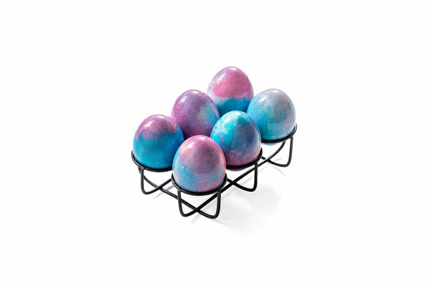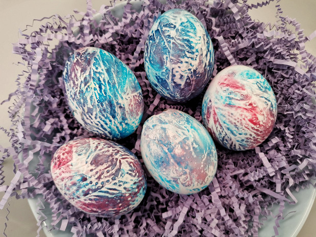 Редкой красоты яйца, с космическим розово-голубым переливом. Тут краситель смешивался с содой и эту кашу мы хаотично наносили на яйцо. Чтобы поверхность скорлупы и цвет стали интенсивней, мы покрыли яйцо растительным маслом.