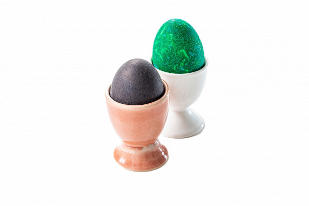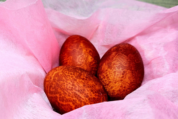 Тут два типа яиц: одни были покрашены в красном вине, другие — в белом с зеленым красителем. Также в покраске яиц участвовал сахар, который потом создал на поверхности скорлупы красивый сверкающий налет.