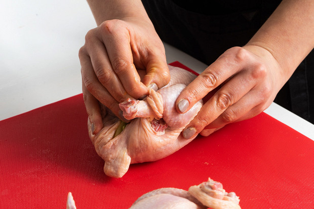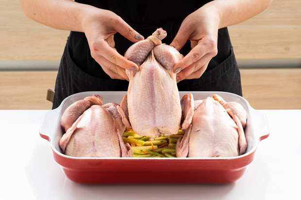 Сделайте небольшие разрезы на коже цыплят в районе гузки. Затем сложите ножки крест-накрест, проденьте в разрезы и зафиксируйте.