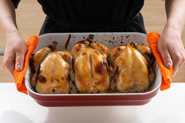 Запекайте цыплят 40 минут в разогретой до 180 градусов духовке, периодически смазывая медовой глазурью, чтобы кожица стала блестящей и зарумянилась.