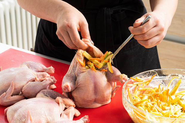 Оботрите цыплят бумажными полотенцами досуха и начините (но не слишком плотно) овощной смесью.