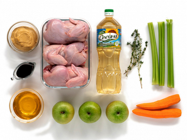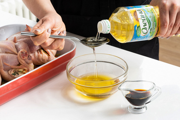 Подготовьте ингредиенты: нам понадобится 3 цыпленка-корнишона (по одному на порцию), овощи для начинки и рафинированное подсолнечное масло «Олейна Классическая» для жарки и запекания.