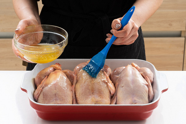 С помощью кисточки смажьте медовой глазурью цыплят.