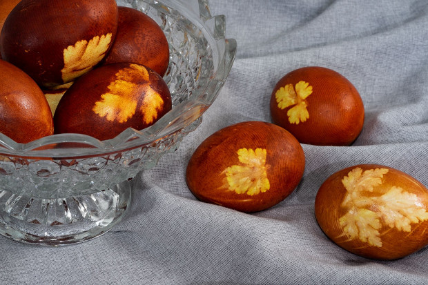 Чтобы яйца получились нарядными, можно взять листочки зелени — петрушки, кинзы или укропа, прилепить их к влажному яйцу, обвязать марлей или капроновым чулком, чтобы прочно прикрепить к скорлупе, и в таком виде яйца отправить в кастрюлю с луковым отваром. «Фон» прокрасится, и на нем появятся белые стебельки и листочки, как по волшебству.