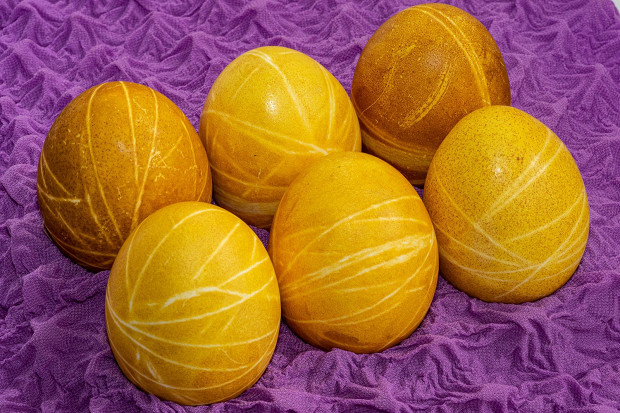 Если хочется чего-нибудь строго индивидуального, например, чтобы на скорлупе появился силуэт чебурашки, можно вырезать силуэт из фольги или плотного полиэтиленового рукава для запекания, плотно обернуть марлей или капроновым чулком. Некоторые умельцы вырезают трафареты из велосипедных шин. Куркумой палитра природных красителей не ограничивается: сок свеклы придаст яйцам розовый оттенок, шпината — зеленый. Но яйца с трафаретами красить следует не в горячем, а в холодном отваре или в свежевыжатом соке, добавив к нему пол-ложки уксуса для фиксации цвета. В кипятке резина или бумага поведут себя непредсказуемо.