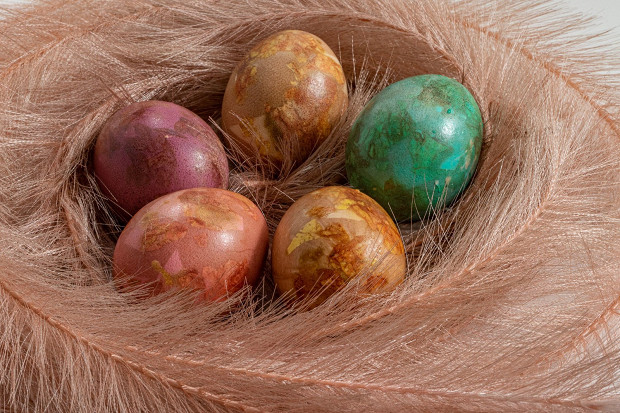 Хотите, чтобы яйца выглядели как россыпь самоцветов? Тогда вам понадобятся пара стаканов пищевого риса и красители разных цветов. Натуральными отварами здесь не обойтись — они окрасят только рис, а не скорлупу яиц. Но и пищевые красители лучше использовать в более концентрированном виде, добавив в них наполовину меньше воды, чем сказано в инструкции.