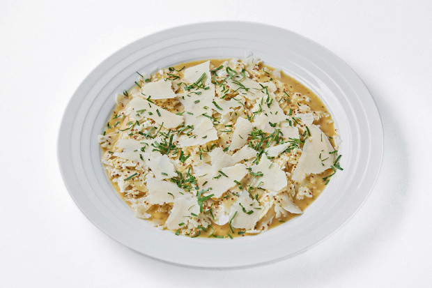 Карпаччо давно превратилось в целый кулинарный жанр и безотказный способ придать нарядный вид любой нарезке: выстеленная, словно белым ковром, ровным слоем съедобных лепестков тарелка выглядит празднично. Сырая цветная капуста для карпаччо — овощ практически идеальный: в ней есть незамутненная ясность, белковый и молочный привкус без лишней травянистости, а при помощи специальной терки ее можно нарезать до толщины бумажного листа. Преодолеть барьер, если вы никогда раньше не пробовали капусту сырой, помогут добавки: наструганный пармезан и капля трюфельного масла — с ними капуста зацветет и запахнет. Никто и не догадается, что у подобной роскоши сырая и сугубо постная основа.