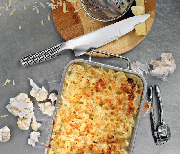 От французского гратена до обычной запеканки — дистанция в полшага. Но разница кроется в деталях: там, где в запеканке важна монолитность, в гратене сложенные в форму отдельные капустные соцветия со всеми их шероховатостями и румяной корочкой сами по себе становятся элементом декора. Связующее звено — сливки, запекаясь в которых сваренная до полуготовности капуста и сама становится кремовой. Специи в гратене играют на полутонах: только белый перец, который, в отличие от резкого черного, не заглушает сливочные нотки, и мускат, чей солнечный запах идет всем молочным блюдам. В ингредиентах также значится грюйер, но подойдет и любой другой пусть и менее породистый, но обязательно плавкий сыр, от сбринца до гауды.