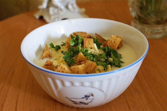 Какие-то прямо детсадовские нежности — кипенно-белый, теплый, пушистый супчик, приносящий витамины и приятные воспоминания в наш организм. Вообще замечено, что цветную капусту дети едят охотнее, чем обычную белокочанную, не говоря уже о красной, с ее чернильным цветом и едким характером. Дабы не уйти в консистенцию каши, суп дополняется хрустящими сухариками. Если же лично вам он кажется блеклым, можно слегка расцветить поверхность пюре, натерев сверху в тарелку пару веточек брокколи или, еще проще, вмешав чайную ложечку песто.