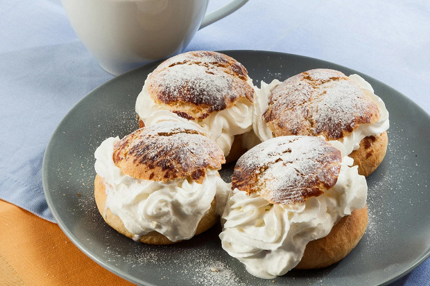 Традиционные шведские булочки с миндальной пастой и взбитыми сливками обычно готовятся к Масленице. С готовых булочек срезают шапочку, внутрь добавляют начинку из миндальной муки и кардамона, а сверху все это богатство украшают взбитыми сливками.