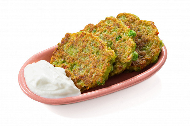 Зеленый горошек дает ощущение свежести блюдам, в которые его изволят пригласить. Можно, конечно, использовать зеленый горошек из банки, как в оливье, но там он слишком темный, слишком перегружен маринадом, чтобы эту свежесть сохранить. Поэтому оладьи мы готовим или в сезон из свежего горошка, или когда угодно — из замороженного. Бекон в данном случае играет роль специи, добавляя оладьям умами: хруст, соленость, белок, все, что нужно, чтобы придать овощным оладьям яркий вкус и фундаментальность. Насчет жира можно не слишком беспокоиться — он останется на сковороде, когда вы бекон поджарите. А если жира не боитесь, то именно на нем можно поджарить и оладьи.
