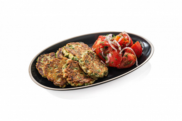 Привычные нам кабачковые оладьи в парадном варианте. В батате есть естественная сладость, от которой безвкусный, но сочный от природы кабачок заметно выигрывает. В нежное тесто мы добавляем чеснок, а готовые оладьи посыпаем кокосовыми чипсами и преподносим со сладким соусом чили. В окружении экзотических вкусов вы привычную дачную еду даже не узнаете, как старую подругу, которая принарядилась, подстригла челку и стала выглядеть на двадцать лет моложе.