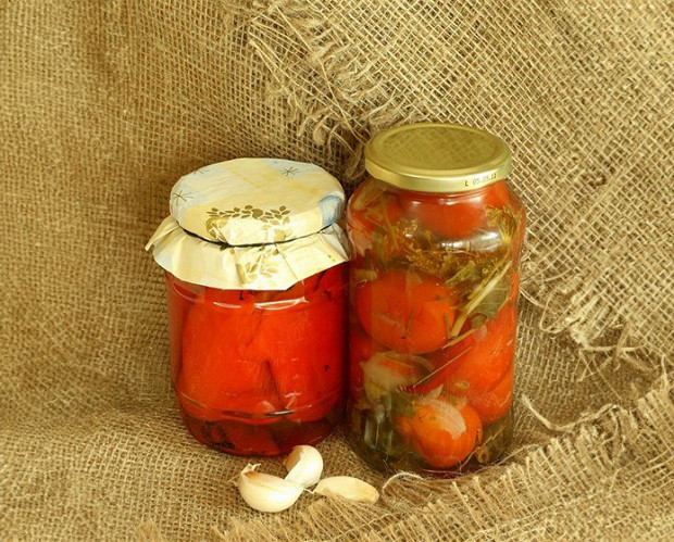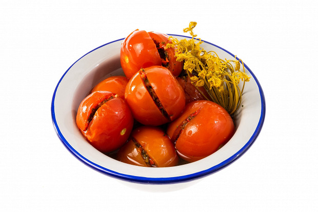 Все то, что обычно лежит рядом с маринованным помидором в банке, оказывается внутри ягоды. За счет этого у помидоров вкус становится куда звонче и ярче. Кроме того, часть начинки — это сладкий болгарский перец, который всегда был лучшим другом помидора.