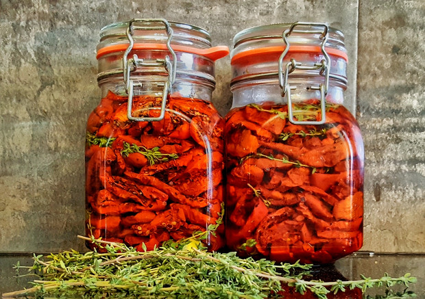Идеальный летний рецепт. Тут указано растительное масло — мы бы использовали вкусное оливковое, чей вкус передастся и помидорам. Обратите внимание: тимьян тут нужен свежий, чтобы его аромат передался всей банке. Ну и, естественно, помидоры должны быть спелыми и вкусными.
