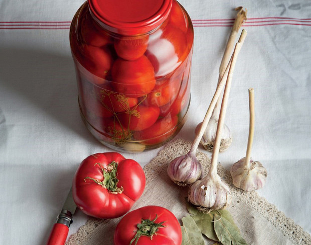 Для этой заготовки нужно два вида помидоров: крупные, для того чтобы они отдали банке свой сок, а сливовидные — чтобы засолить их в банке целиком. Идеальный рецепт, в котором умножение сущности только на пользу.