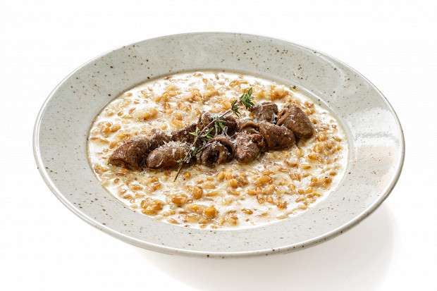 По-итальянски ризотто из перловой крупы называется орзотто (orzo и есть «перловка»). И это не какой-то новодел, а очень древняя еда, вероятнее всего, орзотто намного старше ризотто: рис в Европу привезли сарацины только в XII веке, а ячменем кормили еще римских легионеров. Перловка — тот же ячмень, только очищенный от отрубей. Готовится ячменное зерно дольше, чем рис, а недостаток кремовости приходится компенсировать изрядной дозой сливочного масла. Зато упорные «перлы» просто невозможно передержать, сколько их ни готовь, они всегда будут аль денте в середине, даже если снаружи станут пуховыми. Лучше по таком случаю покупать крупу высокой очистки, чтобы в ризотто ничего не путалось на языке. И сочетать с тем же, с чем бы вы сочетали перловую кашу, — с грибами лучший вариант.