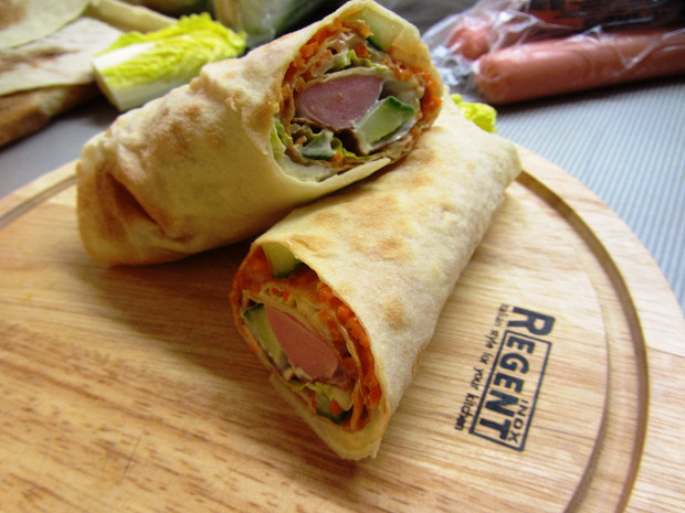 Самый простой способ приготовить сосиску в тесте — это обернуть ее уже готовым лавашем. Соус тут готовится из кетчупа и майонеза, но при желании можно оставить что-то одно. Овощи также варьируются: корейскую морковку можно поменять, например, на свежую редиску.