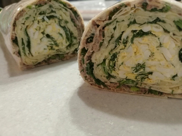 По сути это облегченная версия салата, но лишенная слоев и моркови, зато лихо завернутая в тонкий пшеничный лаваш. Сочетание получилось отличным: лаваш отлично пропитывается жирами и оттеняет яркий характер салата.