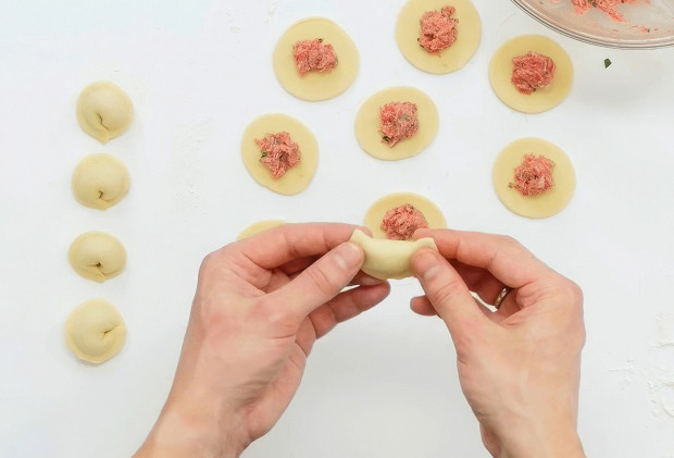 Начинку нужно закладывать подмороженную, иначе из нее начнет выделяться сок и во время варки она превратится в сухую безжизненную субстанцию. Чтобы пельмени хорошо лепились, по краю кружочка можно пройтись мокрыми пальцами. Далее скрепить два противоположных конца кружка, слегка растягивая тесто. И двигаться к середине. Следом взяться за концы полученного ушка и скрепить их друг с другом.