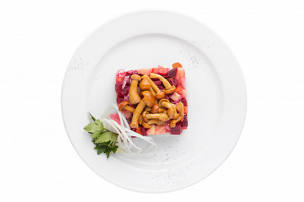 Упругие шляпки грибов украшают любой картофельный салат, и винегрет не исключение. Опята можно положить в винегрет целиком, более крупные грибы нарезать, но не слишком мелко, они не должны затеряться под спудом корнеплодов. Заправлять такой винегрет лучше всего пахучим растительным маслом, «с семечкой».