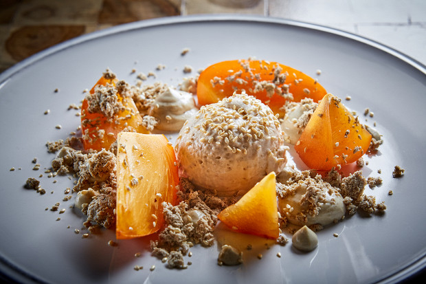 «Гречка очень хорошо сочетается и с хурмой, и с халвой. У нее есть привкус семечек и орехов. Это уникальный продукт: если гречку жарить, то вкус поменяется в одну сторону, подавать с сахаром и молоком — в другую. Халва из подсолнечника тоже имеет ореховый вкус. И у хурмы тоже есть такие оттенки во вкусе. Пожалуйста — три продукта с похожими оттенками во вкусе. А дальше фантазия: как их объединить? Мы сделали мороженое из гречки, положили в тарелку спелую хурму с чуть сладковатым вяжущим вкусом и высыпали сверху теплую халву. У мороженого получается сливочная текстура, а на вкус — сладкая гречневая каша с молоком. То есть гречку мы тоже сделали сладкой, и получилось — три сладких ореховых продукта в одном десерте.