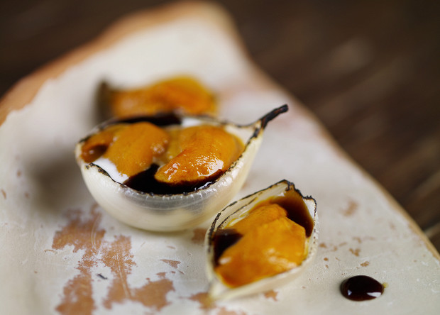 Икра морского ежа с белым шоколадом в печеном луке