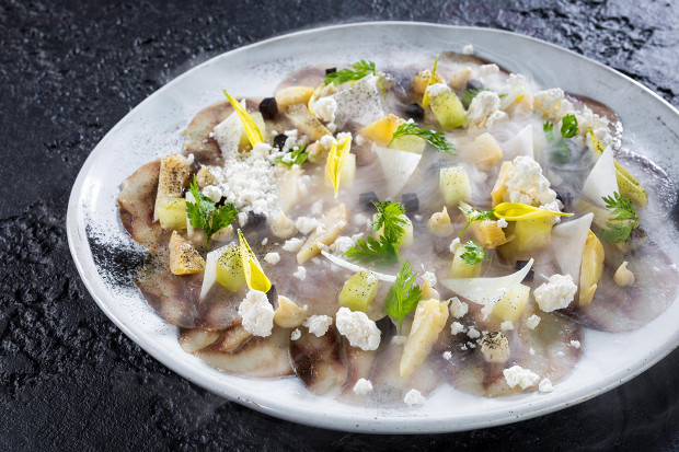 С другой стороны — селедка. Вот у тебя есть хороший продукт, и ты фантазируешь, что из него сделать. Что необычного можно сделать из селедки? Пожарить? Можно, но это из разряда какого-то бешеного креатива для трех человек: меня, моей жены и моего друга. Я делаю еду для людей, поэтому понимаю, что некоторые вещи лучше не трогать, так что селедка — это холодное блюдо. Как ее представить? Банально нарубить. Тартар из селедки уже кто только не делал — тогда карпаччо! Как сделать карпаччо из сельди так, чтобы сохранить и текстуру, и красоту, и вкус? Мы сделали рулет из филе сельди, заморозили, а потом чуть разморозили его — и нарезали тонкими ломтиками. Дальше стали искать, что к этому подойдет. Сельдь мягкая и соленая — значит, нам необходимо что-то хрустящее и нейтральное, может быть, немного сладковатое, чтобы уравновесить вкус. Например, кольраби. И нужен связующий элемент, чтобы все это объединить, чтобы не получилось, что селедка в блюде отделяется от остальных ингредиентов. Хрен? Он все перебьет и получится хреновуха. И так сложилось, что как раз в это время мы прорабатывали бананы. Мы намазали кремом селедку, съели ее — и поняли, что это очень вкусно!