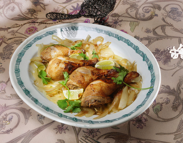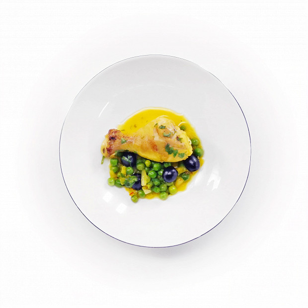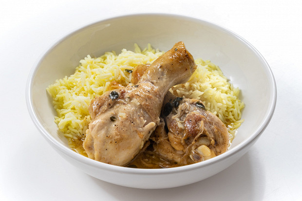 Куриные голени с шафраном, оливками и горошком