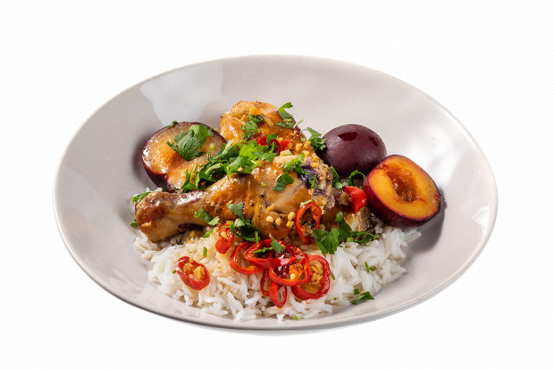 Простой, но неочевидный способ запечь куриные голени. Сначала курица нагревается с маслом, солью и перцем, потом добавляют имбирь и перец чили, а последние 15 минут голени проведут под слоем слив — их кисло-сладкий вкус отлично дополнит вкус птицы.