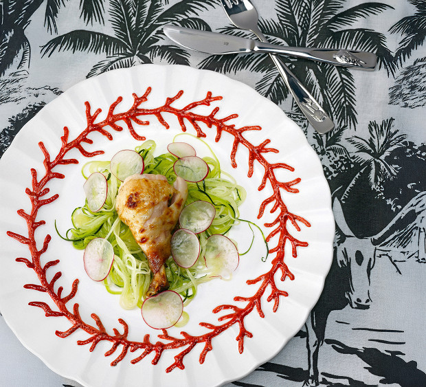 Самое примечательное в этом рецепте — то, каким образом готовится курица. Сначала ее варят в остывающем бульоне, а затем недолго томят в духовке. Подавать такие ножки лучше всего с сочной лапшой из цукини и редиской.