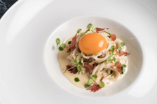 Еще один пример, как добавить локальные ингредиенты в классический итальянский рецепт. Почему бы и не черемша? Ее островатый вкус приглушит жирность панчетты и сливок и сделает блюдо более ярким.