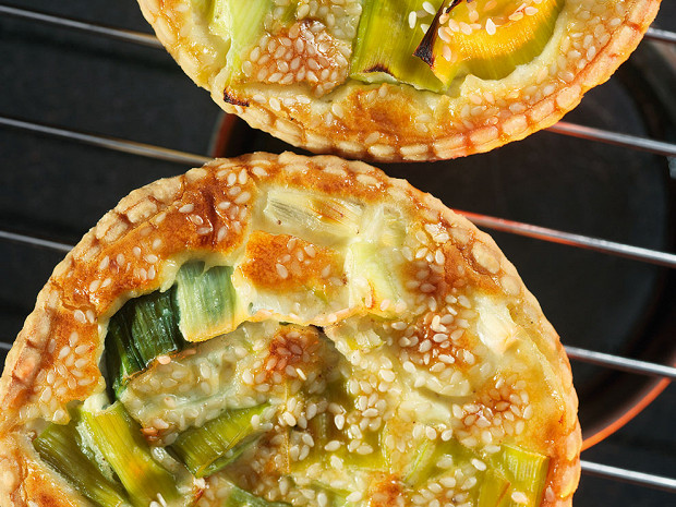 Лук-порей можно не бланшировать, а обжарить в сливочном масле — но так, чтобы его белая часть не перестала быть белой. Рассыпанный как бог на душу положит кунжут слегка припорашивает размашистую луковую зелень.