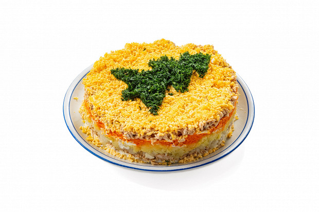 Идеальная новогодняя еда, которая должна быть приготовлена по всем правилам, например, с банкой консервированной горбуши в собственном соку, как в этом рецепте. Салат можно особо не солить, так как в рыбе и майонезе уже есть соль.