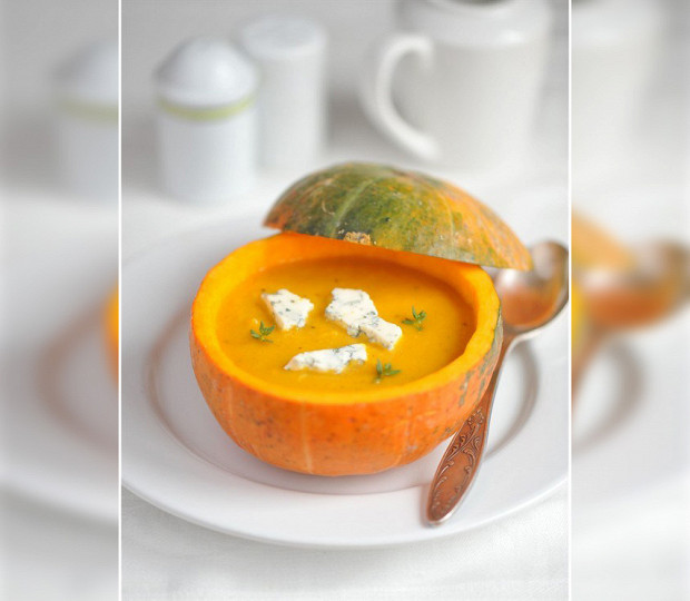 Вы удивитесь, но сладкая тыква замечательно сочетается с пряным и ярким сыром, например с рокфором. Если этого вида под рукой нет, подойдет и самый обычный дорблю.
